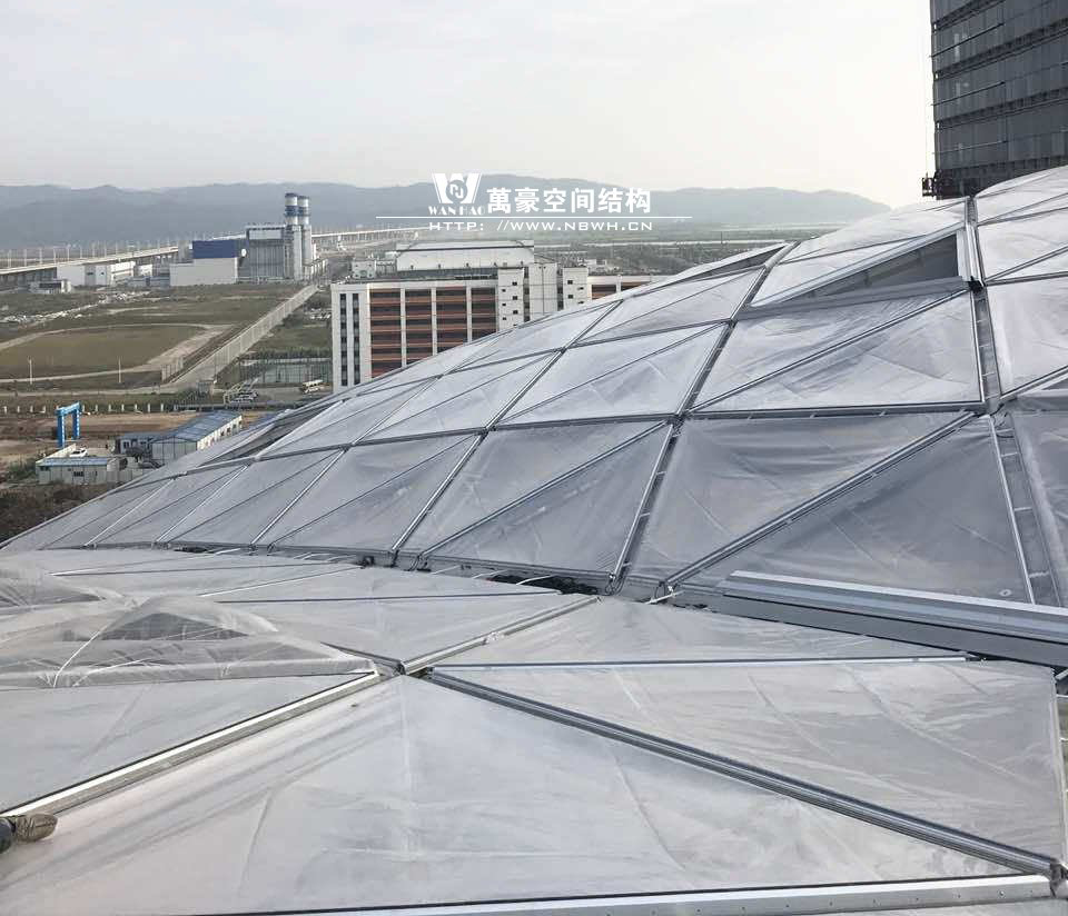 橫琴國際科技創(chuàng)新中心膜結(jié)構(gòu)工程位于廣東省珠海市橫琴新區(qū)。本工程一期用地面積22119㎡,總建筑面積63486.63㎡。建筑高度為36.5m,結(jié)構(gòu)形式為骨架式氣枕膜結(jié)構(gòu);上部為鋼結(jié)構(gòu)單層雙曲面鋼網(wǎng)殼+雙層ETFE氣枕膜覆蓋,氣枕總面積約23000平方米,共計750個ETFE氣枕,93個開啟式天窗,3000多根桿件組成,用鋼量2000多噸,單體構(gòu)件大結(jié)構(gòu)復(fù)雜。