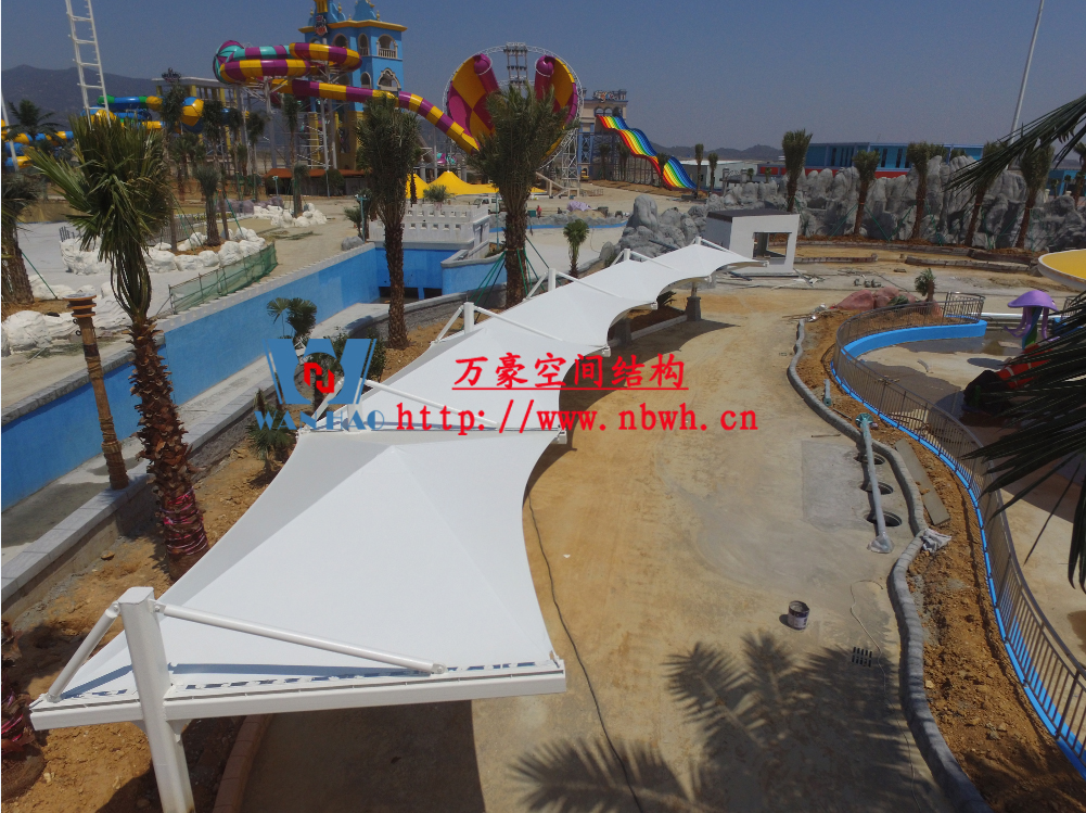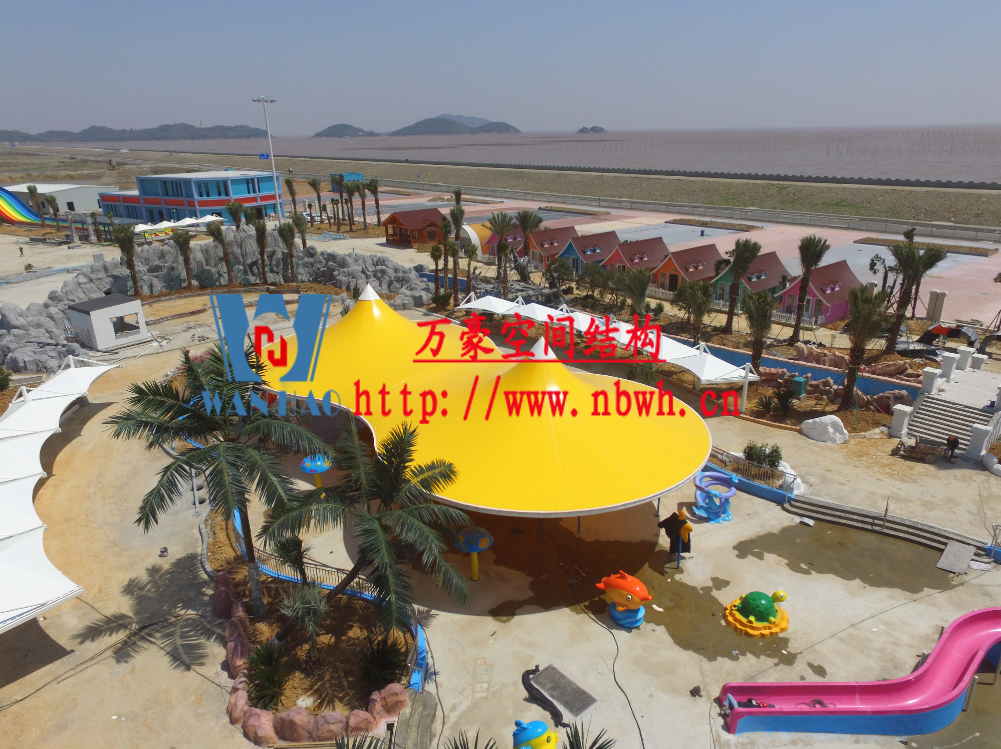 海闊天涳水世界位于浙江省象山縣大目灣新城,北與松蘭山國家“AAAA”級風(fēng)景旅游區(qū)相接,東臨大目洋,南連東陳鄉(xiāng),距象山縣城8公里,成為大目灣新城最先動建的重大膜結(jié)構(gòu)功能性項目,由寧波萬豪空間結(jié)構(gòu)工程有限公司承建。現(xiàn)場測量、深化設(shè)計、制作及安裝由寧波萬豪空間結(jié)構(gòu)工程有限公司全權(quán)負(fù)責(zé);用鋼量高達(dá)180噸,建筑面積達(dá)5000平米。