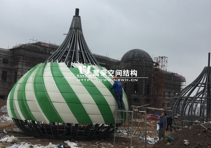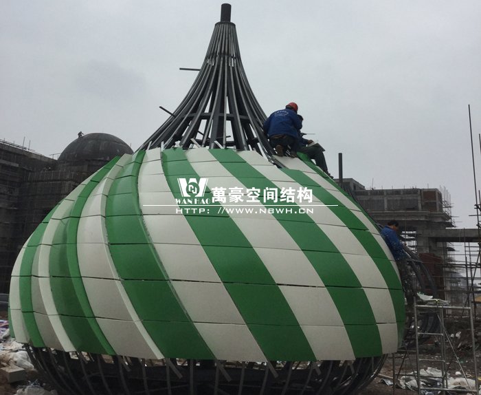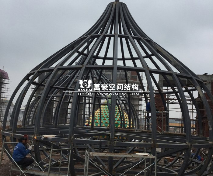 俄羅斯館鋼結構階段,館頂鋼結構正在制作施工中。