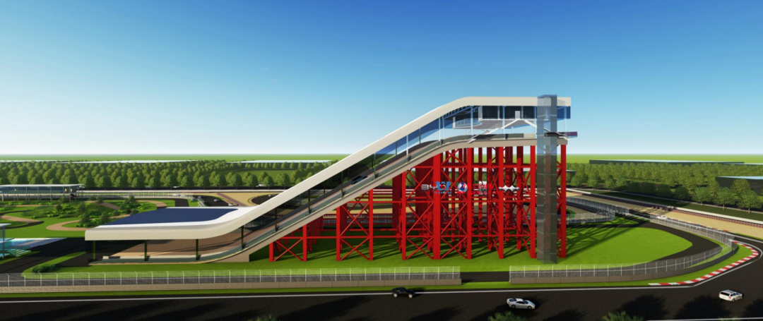 比亞迪紹興嵊州賽車場以極速競技與自然景觀的融合為設(shè)計(jì)核心,干拔沙坡觀景平臺(tái)作為賽道的標(biāo)志性節(jié)點(diǎn),同時(shí)滿足了功能性、標(biāo)志性與生態(tài)協(xié)調(diào)性。設(shè)計(jì)靈感來源于賽車疾馳時(shí)揚(yáng)起的沙浪與風(fēng)動(dòng)軌跡,通過鋼結(jié)構(gòu)的剛性骨架與膜材的柔性質(zhì)感,塑造出如沙丘起伏般的動(dòng)態(tài)形態(tài),既呼應(yīng)賽車場的速度美學(xué),又為觀眾提供遮陽避雨的舒適空間。該項(xiàng)目PTFE膜屋面展開超3萬平方米。
