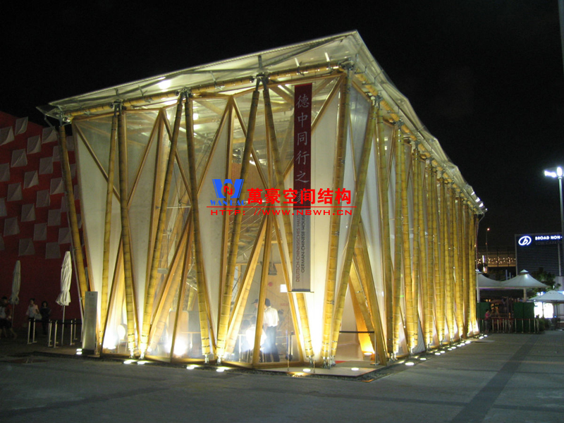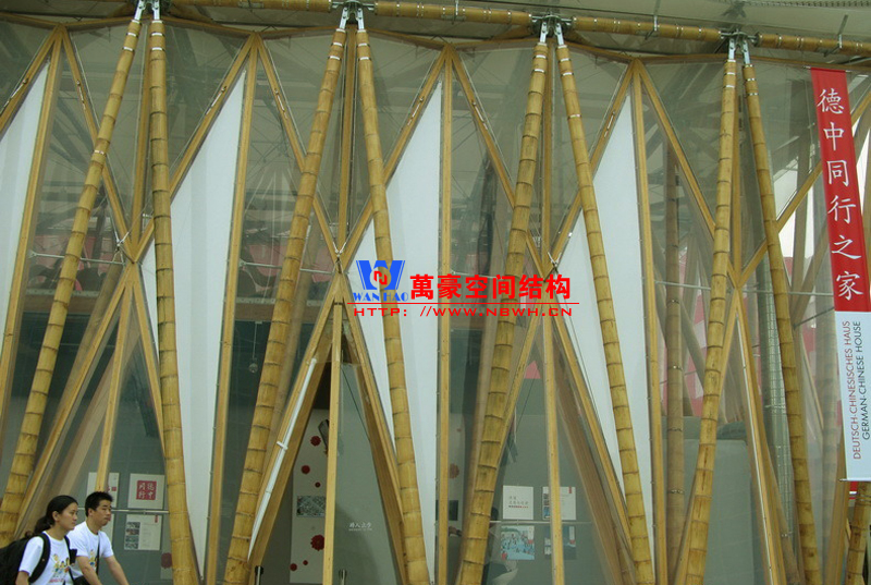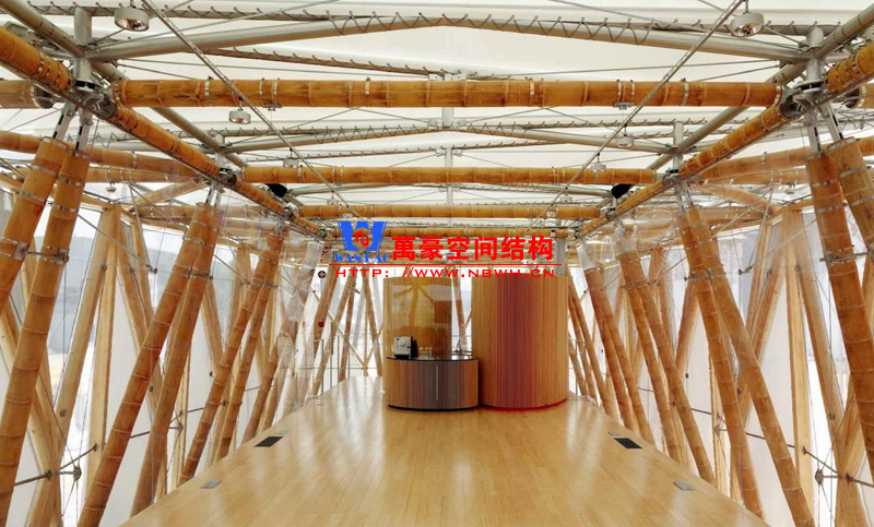 德中館展館膜結構內(nèi)部樓板由膠合竹板制成的巨型梁柱體系架構,其連接構件及表面處理技藝均為此建筑量身打造。高達六米的梁柱將建筑內(nèi)部進行二次分割,營造出獨立的二層樓面空間。竹桿支撐體系在建筑屋面層通過鋼節(jié)點相互連接固定。屋面面層采用PVC 膜覆蓋,墻體結構則由天然竹材和透明輕盈的新型材料ETFE膜復合構成。整個膜結構建筑體現(xiàn)了可持續(xù)和環(huán)保的理念,易建易拆,所有材料皆可回收或重復使用;材料來源本地化,除特殊結構件外多數(shù)產(chǎn)自中國本土。