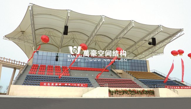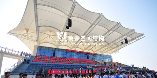 南昌瑤湖國(guó)際水上運(yùn)動(dòng)中心膜結(jié)構(gòu)看臺(tái)整體工程呈骨架式單挑懸臂梁結(jié)構(gòu),縱向跨度達(dá)到20米,總長(zhǎng)度約52米,每檔間距為8.5米,充分體了膜結(jié)構(gòu)具有大跨度,易施工的結(jié)構(gòu)特點(diǎn),同時(shí)它的經(jīng)濟(jì)實(shí)用性和視覺(jué)美觀性也得到了完美的體現(xiàn)。