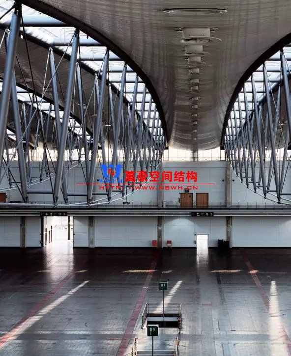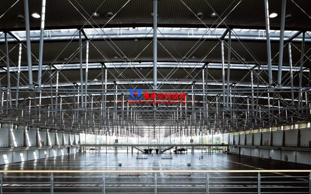 漢諾威會(huì)展中心是世界上最大、最負(fù)盛名的會(huì)展中心,超過(guò)50萬(wàn)m2的凈展面積和每年超過(guò)50場(chǎng)的頂級(jí)展會(huì),使其幾十年來(lái)穩(wěn)居行業(yè)龍頭地位。1994年,在漢諾威會(huì)展中心4號(hào)展廳的競(jìng)賽中,德國(guó)gmp國(guó)際建筑設(shè)計(jì)有限公司(以下簡(jiǎn)稱gmp)和sbp結(jié)構(gòu)工程師事務(wù)所(以下簡(jiǎn)稱sbp)聯(lián)袂中標(biāo)。展廳提供了一個(gè)通過(guò)玻璃采光頂自然采光的185.6m×116m的無(wú)柱大空間,凈展面積超過(guò)21 500㎡。雙層屋面結(jié)構(gòu)的下層以承重金屬波形板將屋頂下的設(shè)備管道保護(hù)起來(lái),同時(shí)利用雙層金屬板結(jié)構(gòu)之間的空腔進(jìn)行正壓送風(fēng),使得灰塵難以進(jìn)入到空腔和管道。4號(hào)廳可以舉辦多種不同類型的活動(dòng),特別是容易產(chǎn)生灰塵的馬術(shù)等。