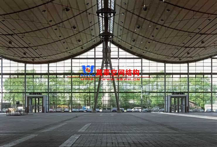 126m的跨度在2001年被譽(yù)為“中國(guó)第一跨度”。結(jié)構(gòu)設(shè)計(jì)中采用了一系列措施讓這個(gè)“中國(guó)第一跨度”在確保建筑意圖的前提下得以高效實(shí)現(xiàn)。大型屋面采用下張弦體系減少鋼梁彎矩,為了獲得與鋼箱梁匹配的剛度,下弦采用了直徑最大為150mm的高強(qiáng)鋼拉桿,這一設(shè)計(jì)也間接推動(dòng)了國(guó)內(nèi)自主高強(qiáng)鋼拉桿的高速發(fā)展。施工過(guò)程中采用了先滑后固的方式釋放了自重下的柱腳水平推力,減少結(jié)構(gòu)內(nèi)力。采用連續(xù)梁檁條,大幅度降低了30m跨度檁條的用鋼量。