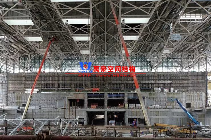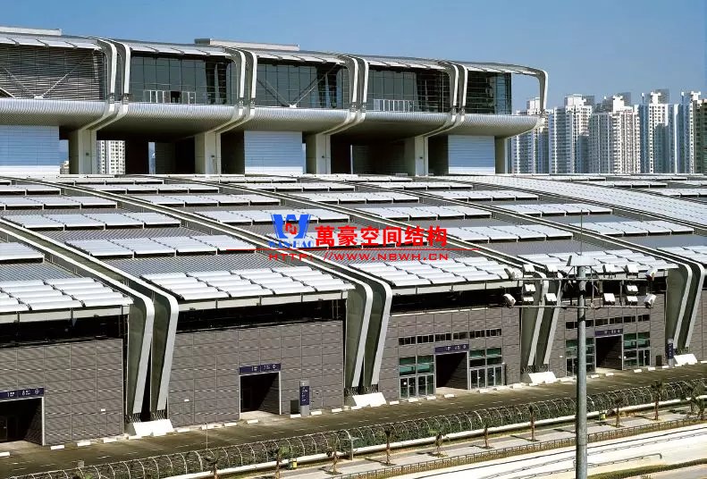 占據(jù)著整個(gè)會(huì)展中心核心位置的入口大廳采用輕盈、潔白的體塊跨越95m的無(wú)柱空間,支承在兩側(cè)的耳房上,并在大廳設(shè)置了通透的玻璃幕墻。為了避免微拱的屋面桁架將很大的水平荷載傳遞給混凝土結(jié)構(gòu),結(jié)構(gòu)工程師沿用了深圳會(huì)展中心的先滑后固的支座施工技術(shù),在大幅減小拱腳水平推力的同時(shí),亦保證了在風(fēng)、雪、地震荷載作用下可以將荷載均勻地傳遞給兩側(cè)的承載結(jié)構(gòu)。