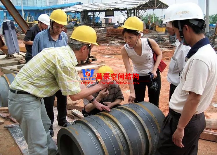 精心設(shè)計(jì)和建造的柱腳節(jié)點(diǎn)成為了整個(gè)項(xiàng)目的亮點(diǎn)。為了保證其轉(zhuǎn)動(dòng)能力和側(cè)力傳力可靠,按設(shè)計(jì)要求,柱腳鉸支座的安裝精確到間隙不能超過(guò)15mm,這意味著跨度126m、高26m、重約500t的鋼箱梁連接在鉸支座上,兩邊間隙只能放進(jìn)兩根頭發(fā)絲。這些經(jīng)驗(yàn)為后續(xù)其他項(xiàng)目的鋼結(jié)構(gòu)加工和驗(yàn)收提供了非常重要的技術(shù)支持。