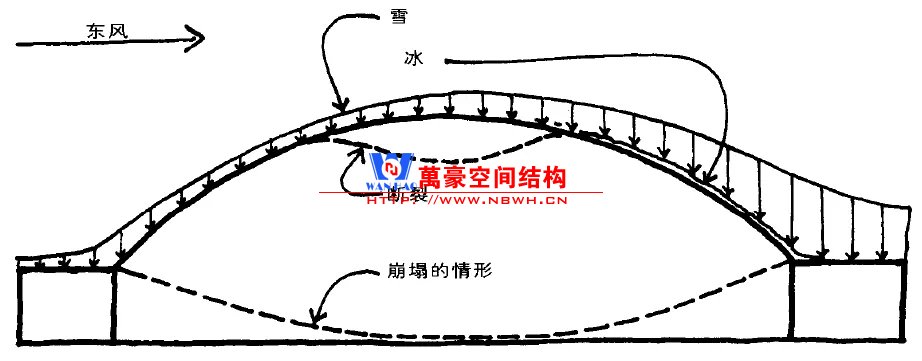 當晚,大雪在風力作用下在穹頂上產(chǎn)生了飄移,雪堆積在背風面造成了不均勻荷載。雖然總體雪荷載只有設計總荷載的1/4,但卻集中在屋頂表面的1/3區(qū)段,不均勻荷載分布造成了倒塌。