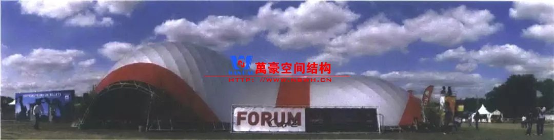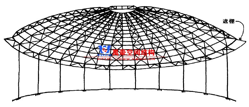 查爾斯.威廉郵政學院(CharlesWilliam Post College)于1970年建造了一個劇院。屋面采用鋼結構穹頂,穹頂直徑約52米,由環(huán)繞于四周的鋼柱支承,鋼柱間沿經(jīng)線均勻布置四十榀鋼管桁架。穹頂頂部設鋼壓力環(huán),底部采用圓形的雨棚作為拉力環(huán)。緯向每隔一格布置連續(xù)十字交叉支撐。