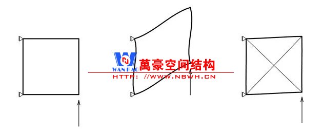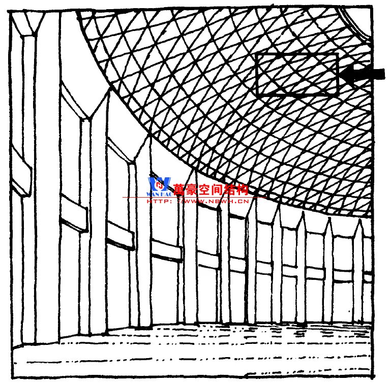 提高平面內剛度的直接方式是采用三角形網(wǎng)格。富勒發(fā)明了短線呈穹頂,并應用于1967年蒙特利爾國際博覽會上的美國館——一座直徑為76m的3/4球形建筑。