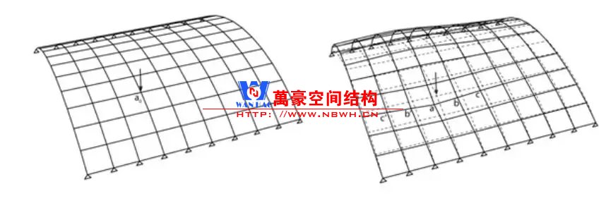 網(wǎng)殼受力方式為薄膜作用,屬于拱結構向三維的拓展;因此,與拱類似的問題會出現(xiàn)在網(wǎng)殼上。比如:整體穩(wěn)定問題;不對稱荷載敏感等。