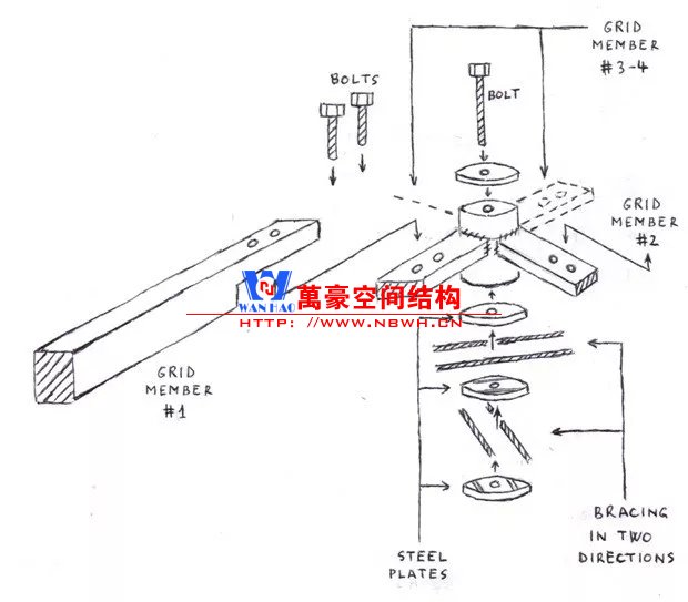 為了運輸和安裝的方便,所有的桿件被設計成了1m的標準長度,在節(jié)點處由螺栓連接。