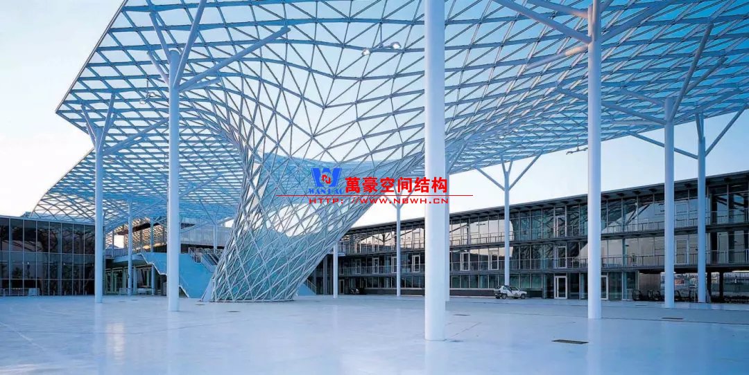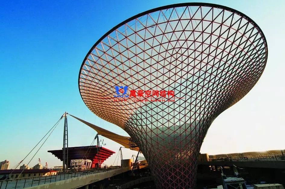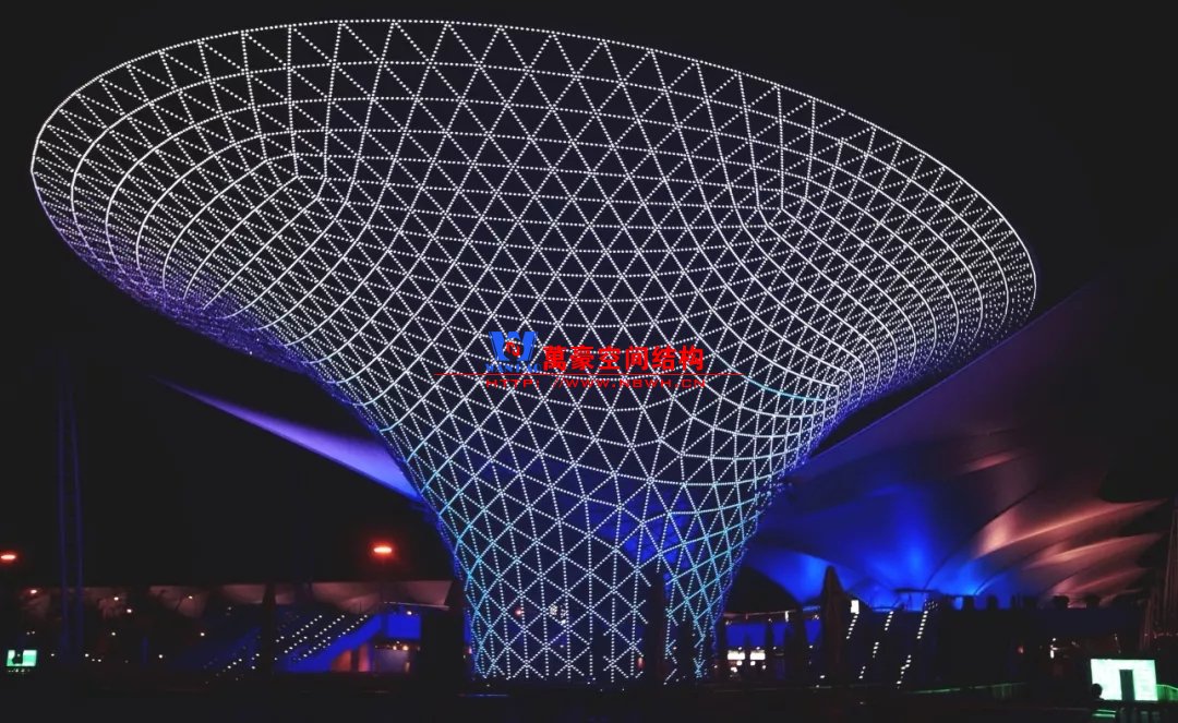 有的天幕雖然設(shè)計(jì)為曲面,但其曲面形狀的力學(xué)性能差,結(jié)構(gòu)受力仍然以抗彎為主。這類(lèi)曲面天幕結(jié)構(gòu)與樹(shù)形柱相結(jié)合,才能以較細(xì)小的結(jié)構(gòu)構(gòu)件完成。