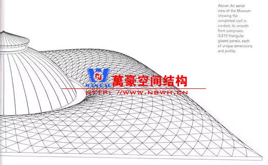 沿中心圓徑向布置主受力網(wǎng)格,再輔助另兩個(gè)方向的圓弧線條劃分出1656個(gè)三角形平面玻璃板。
