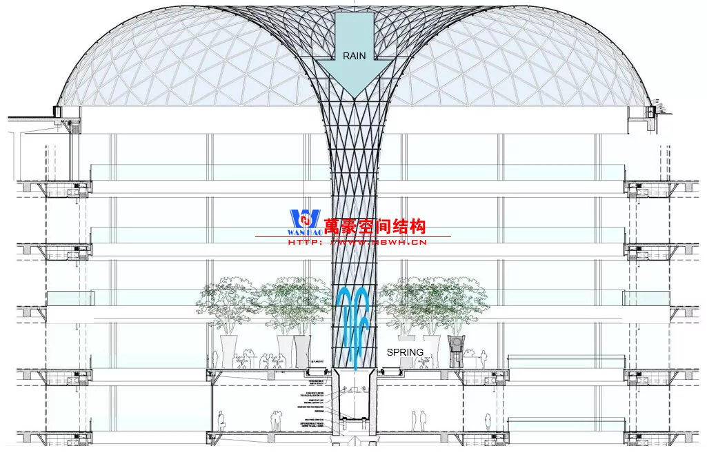巨大透明天幕能增強(qiáng)自然采光和視覺(jué)通透性,然而另一方面,也帶來(lái)眩光和太陽(yáng)熱輻射增加等潛在問(wèn)題。因此,設(shè)計(jì)師采用低輻射鍍膜玻璃、通風(fēng)裝置和氣簾、雨水收集系統(tǒng)等兼顧了訪客的最佳舒適度和綠色生態(tài)品質(zhì)。
