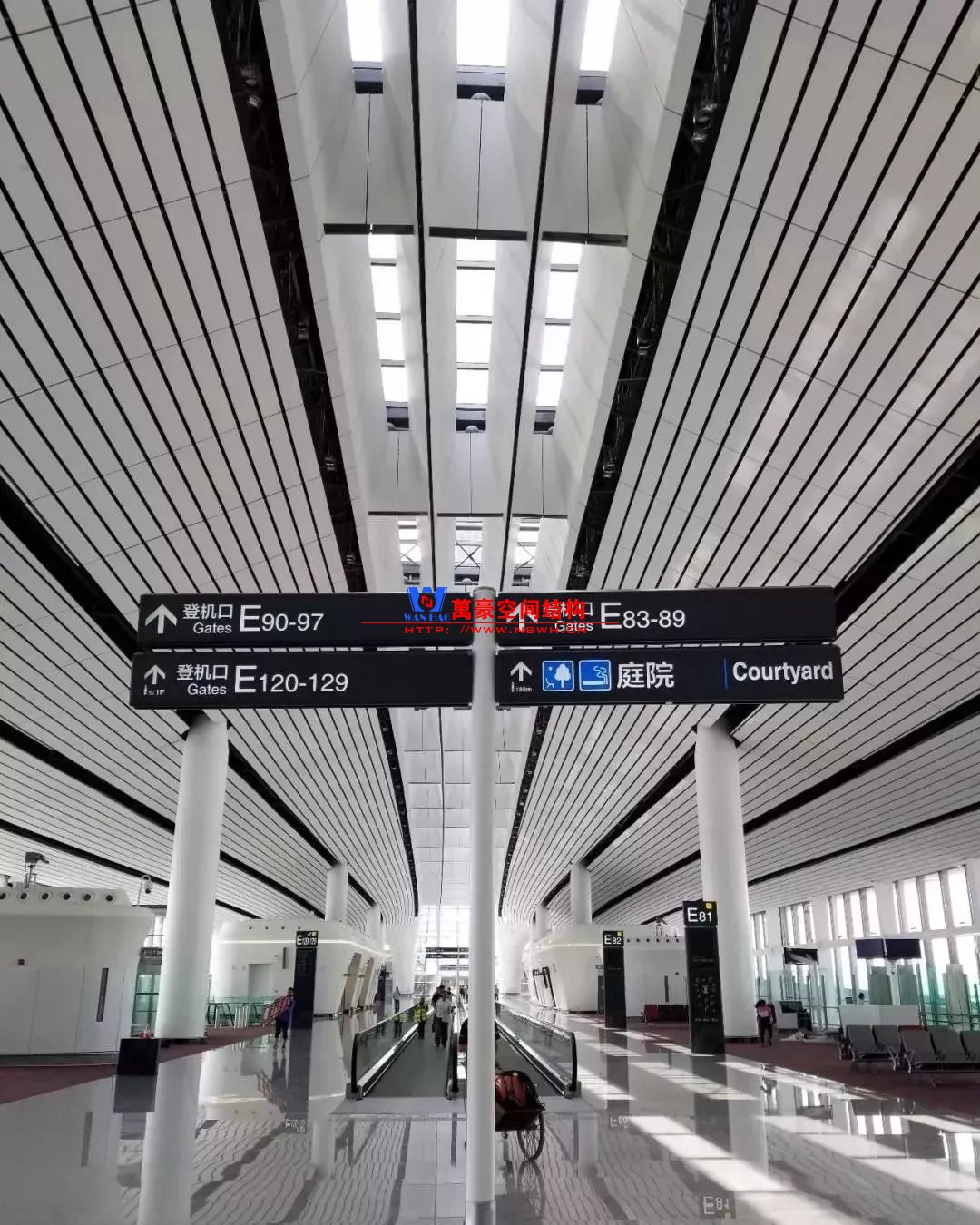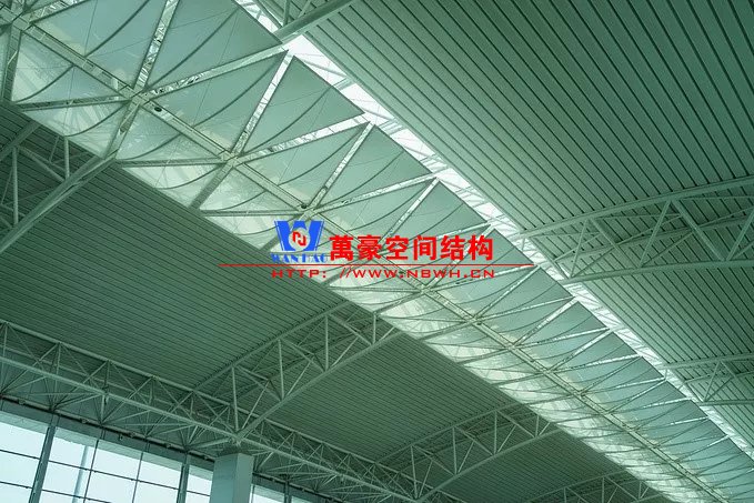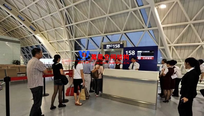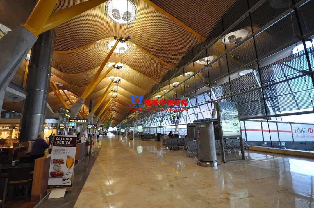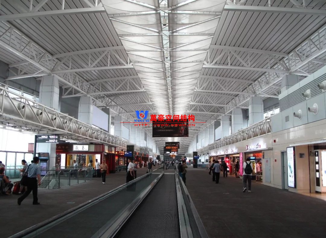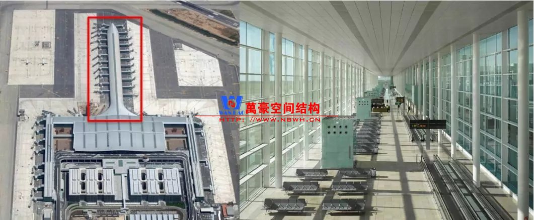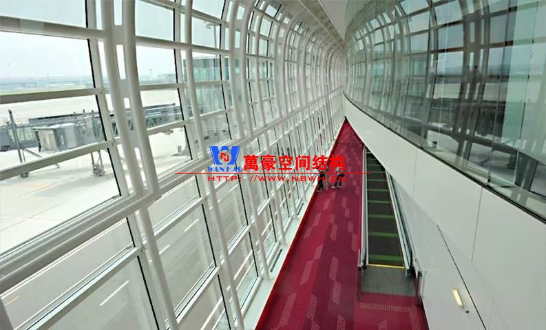 如巴塞羅那機場的指廊就是采用簡單的鋼框架結(jié)構(gòu)體系,鋼柱布置于兩邊;幕墻采用剛性幕墻,貼近鋼柱外側(cè)布置;室內(nèi)吊頂無天窗,吊頂走向沿長向,空間上有指向性。