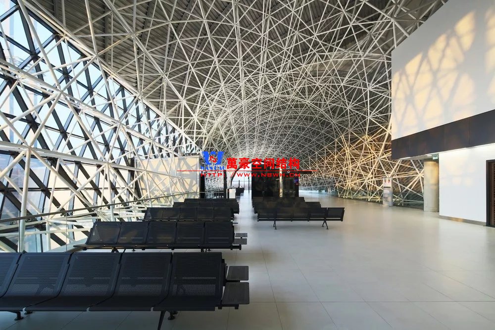 克羅地亞札格瑞布機場剖面也是筒形,結(jié)構(gòu)采用網(wǎng)架結(jié)構(gòu),但網(wǎng)架沒有外包。網(wǎng)架構(gòu)件和網(wǎng)架球節(jié)點直接暴露在近人的尺度,但從照片上看并沒有顯得很雜亂,這可能是因為結(jié)構(gòu)構(gòu)件和節(jié)點的尺度控制的很好,細而密的構(gòu)件顯得比較精細。