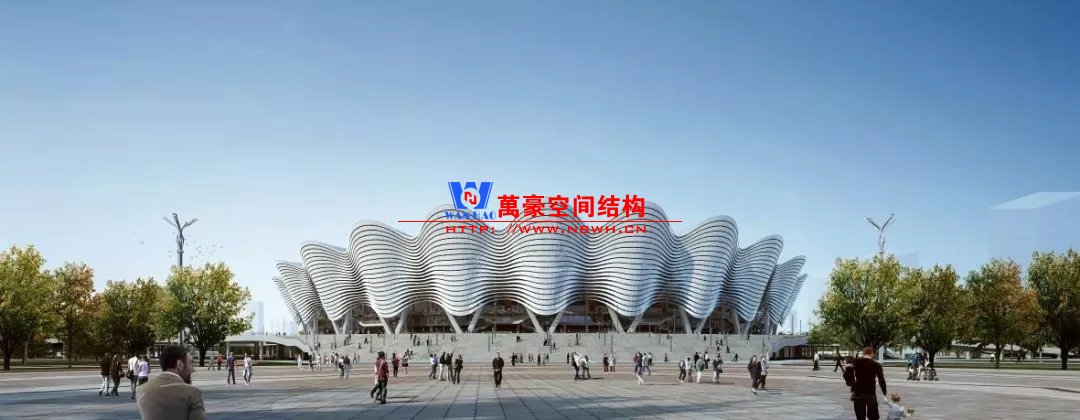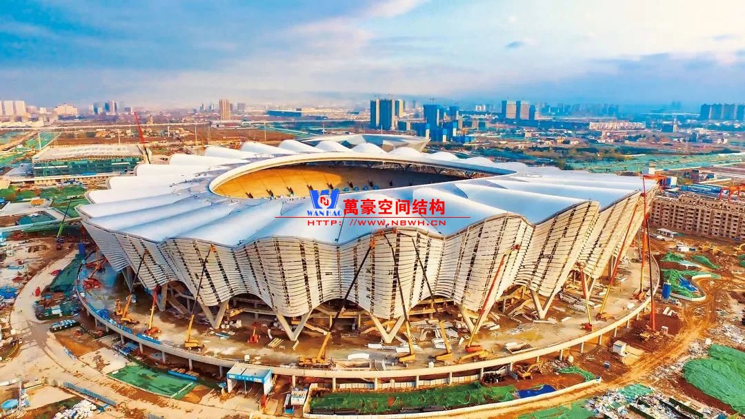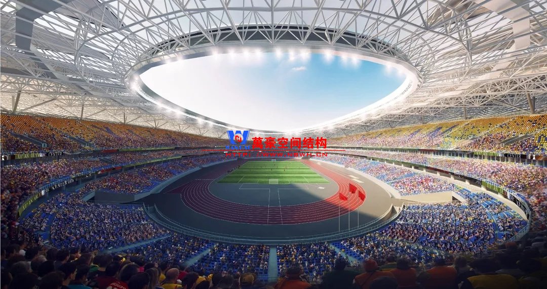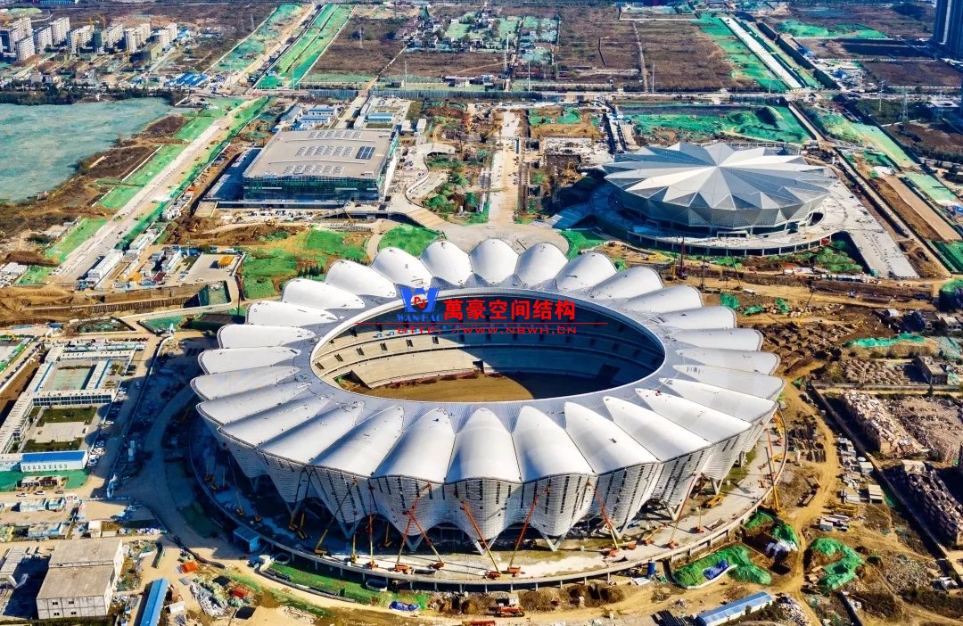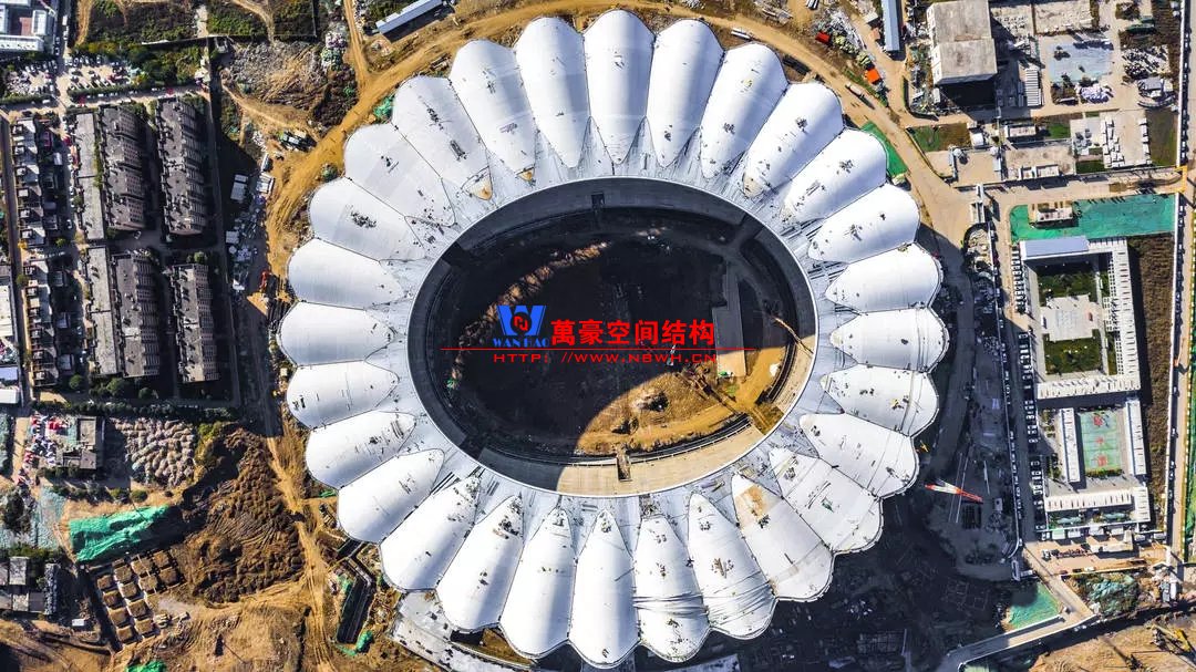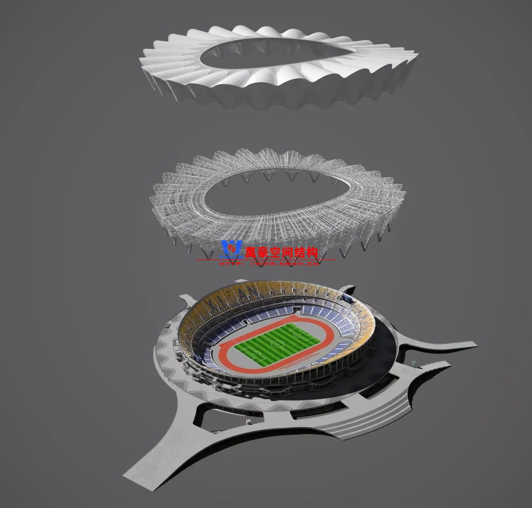 體育場(chǎng)主體建筑為南北長(zhǎng)332m、東西寬316m的橢圓形,鋼結(jié)構(gòu)罩棚最高處高58.3m,最低處高42.6m;中間開(kāi)口南北長(zhǎng)200m、東西寬153m。主體鋼結(jié)構(gòu)采用空間懸挑鋼桁架結(jié)構(gòu),由28個(gè)V形柱支撐72片鋼結(jié)構(gòu)管桁架,整體東西高,南北低,呈馬鞍形,體育場(chǎng)看臺(tái)為框架-剪力墻體系。屋頂圍護(hù)結(jié)構(gòu)為鋁鎂錳直立鎖邊金屬屋面,罩棚立面采用銀白色穿孔鋁板幕墻系統(tǒng),通過(guò)有韻律的變化,表達(dá)了絲綢飄舞的動(dòng)感,輕盈通透的罩棚在夜晚能夠透出賽場(chǎng)內(nèi)熱烈的賽事氣氛,宛如皓月長(zhǎng)空下綻放的盛世之花。碗型看臺(tái)分為上、中、下三層座席,并在中上層看臺(tái)之間設(shè)置包廂層(包括66個(gè)大小包廂)及其座席區(qū),觀眾分別由各層看臺(tái)對(duì)應(yīng)的通道進(jìn)入。