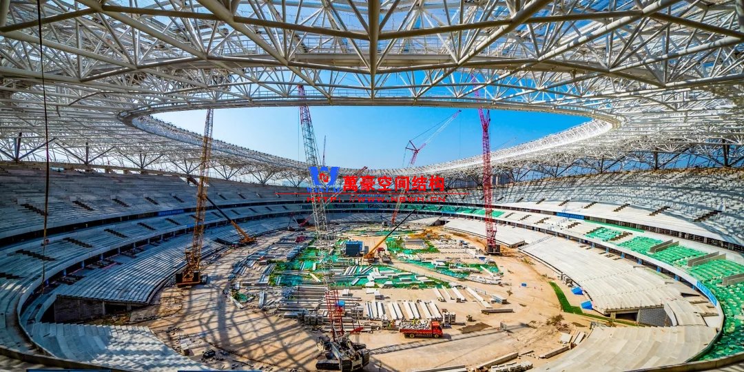 體育場(chǎng)罩棚整體造型呈馬鞍形,采用空間管桁架懸挑結(jié)構(gòu)體系,南北長(zhǎng)332m,東西寬316m,罩棚最高58.3m。2019年1月1日首吊,鋼結(jié)構(gòu)分包中建鋼構(gòu)歷時(shí)87天,消耗近5萬(wàn)工日、逾5千機(jī)械臺(tái)班,完成168單元、9500噸罩棚鋼桁架吊裝工作,于3月28日提前合攏。