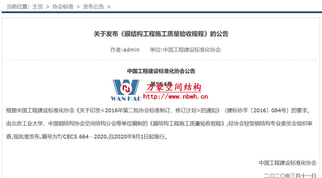 根據(jù)中國工程建設(shè)標(biāo)準(zhǔn)化協(xié)會《關(guān)于印發(fā)<2016年第二批協(xié)會標(biāo)準(zhǔn)制訂、修訂計劃>的通知》(建標(biāo)協(xié)字〔2016〕084號)的要求,由北京工業(yè)大學(xué)、中國鋼結(jié)構(gòu)協(xié)會空間結(jié)構(gòu)分會等單位編制的《膜結(jié)構(gòu)工程施工質(zhì)量驗收規(guī)程》,經(jīng)協(xié)會輕型鋼結(jié)構(gòu)專業(yè)委員會組織審查,現(xiàn)批準(zhǔn)發(fā)布,編號為T/CECS 664-2020,自2020年9月1日起施行。