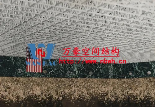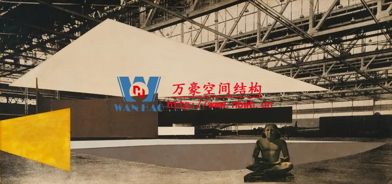 1942年,密斯制作了一個音樂廳的照片拼貼畫,采用阿爾伯特·康于1937年設(shè)計的格倫·馬丁飛機組裝大樓的室內(nèi)做為背景,在其中設(shè)置了木材和鋼板制成的靈活的墻和頂棚,疊加上他的基本空間概念。阿爾伯特·康是為亨利·福特和其他底特律汽車工業(yè)家服務(wù)的建筑師,設(shè)計了適應(yīng)于汽車生產(chǎn)線的大空間廠房。30年代末,美國的鋼鐵技術(shù)已經(jīng)能夠生產(chǎn)更大的斷面,焊接方法開始在建筑中替代鉚接,使節(jié)點更為簡潔。這些新技術(shù)促成了更大跨度的屋蓋,增加了建筑空間的可能性。1952-1953年,密斯又發(fā)展了康拉德·瓦克斯曼為美國空軍機庫所設(shè)計的結(jié)構(gòu),為芝加哥會議中心設(shè)計了一個會議大廳,約720英尺見方,屋面采用網(wǎng)架結(jié)構(gòu),結(jié)構(gòu)高度約30英尺,側(cè)面端頭懸挑達(dá)60英尺。拼貼畫的室內(nèi)使用大理石紋理代表大空間內(nèi)的墻體飾面。密斯引用康和瓦克斯曼的結(jié)構(gòu)做為自己作品的支撐,啟示了一個鋼結(jié)構(gòu)通用大空間的新時代。