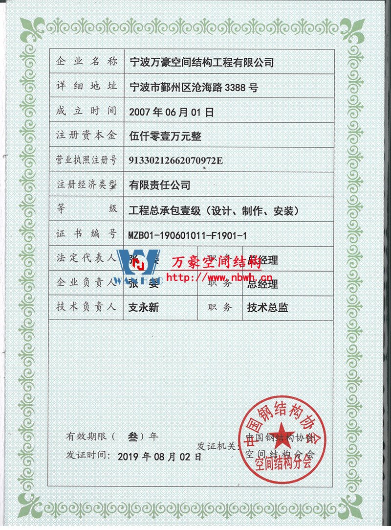 • 膜結(jié)構(gòu)工程總承包特級(jí)(設(shè)計(jì)、制作、安裝)資質(zhì),鋼結(jié)構(gòu)工程二級(jí)資質(zhì)