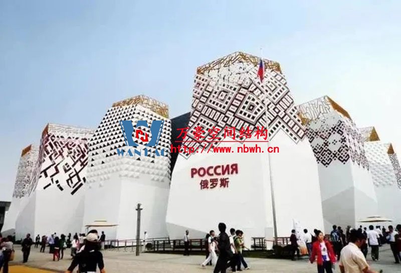 俄羅斯館是4個保留場館中規(guī)模最大的自建館,由12個象征著生命之花以及世界之根的白金紅三色塔樓組成,塔樓頂部的鏤空金屬花格各不相同。