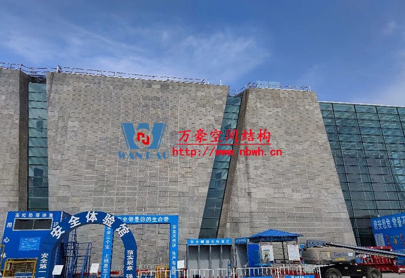 此外,整個意大利館玻璃幕墻部分全部更換,主入口處玻璃幕墻立柱采用“原鋼骨架立柱+魚腹式桁架”形式進(jìn)行加固。