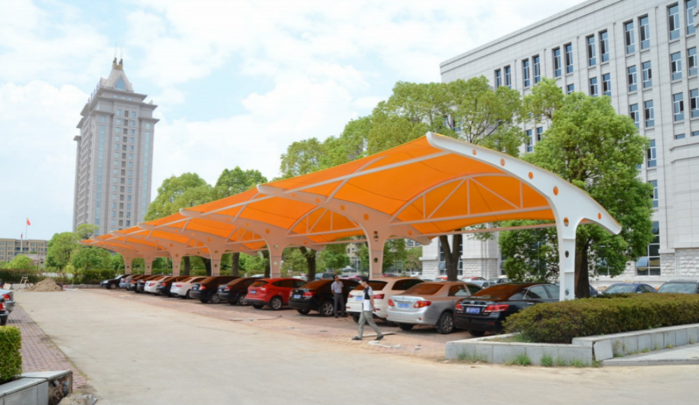 第二點,膜結(jié)構(gòu)停車棚頂部封板采用茶色(顏色可挑選)陽光板封頂,與車棚整體骨架用壓條鉚接固定,耐酸堿腐蝕,有足夠強度對棚內(nèi)車輛起到保護作用;