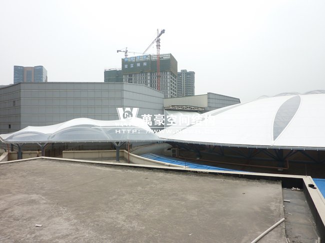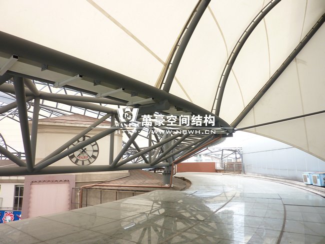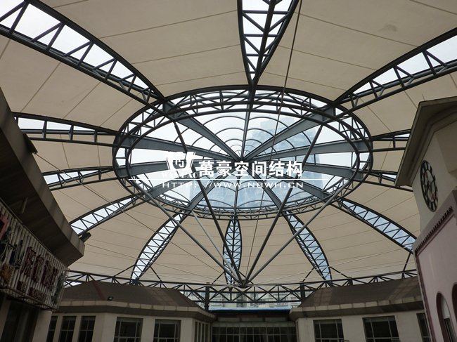 工程位于蕭山開元廣場商業(yè)購物中心,整體工程采用骨架穹頂結構,屋面直徑為50米,總面積約6000平方米,屋蓋體系脈絡清晰流暢,造型簡潔有力,力圖體現(xiàn)結構與材料的自身美感,精致的鋼架,潔白的膜材,賦予建筑高技派和未來主義色彩。
