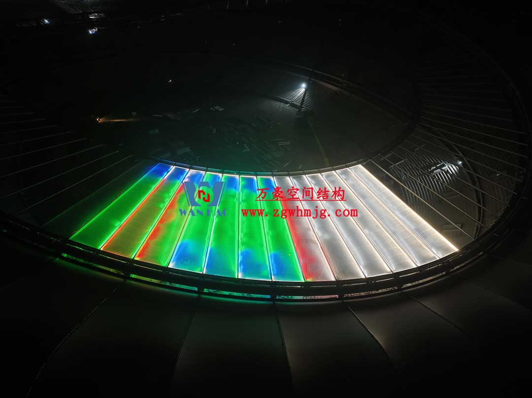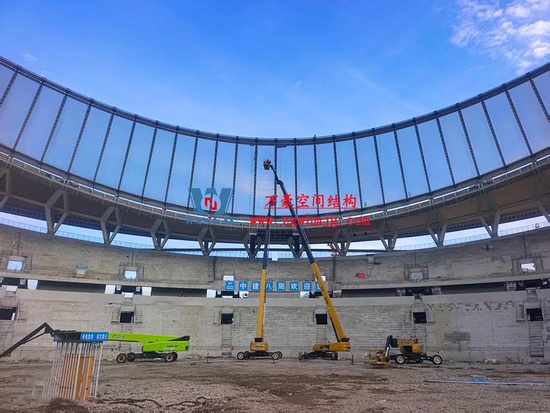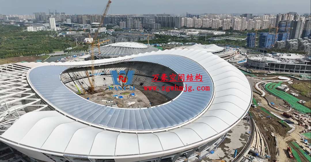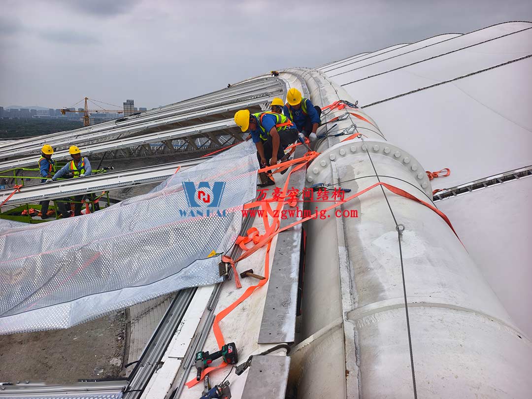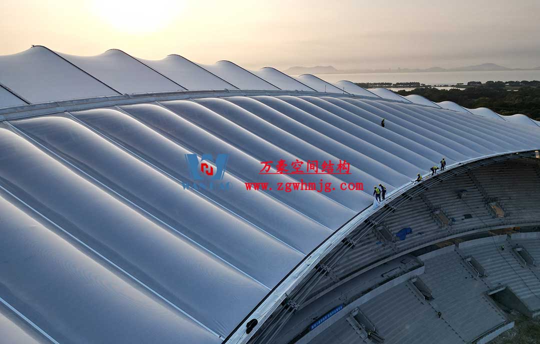 該項(xiàng)目采用車輻式索膜結(jié)構(gòu)體系,其中膜結(jié)構(gòu)由屋面內(nèi)環(huán)ETFE氣枕結(jié)構(gòu)、屋面外環(huán)PTFE膜結(jié)構(gòu)及立面PTFE膜結(jié)構(gòu)組成。 其中,屋面ETFE氣枕由萬豪空間結(jié)構(gòu)深化設(shè)計(jì)及安裝,ETFE氣枕投影面積20000平方米左右。