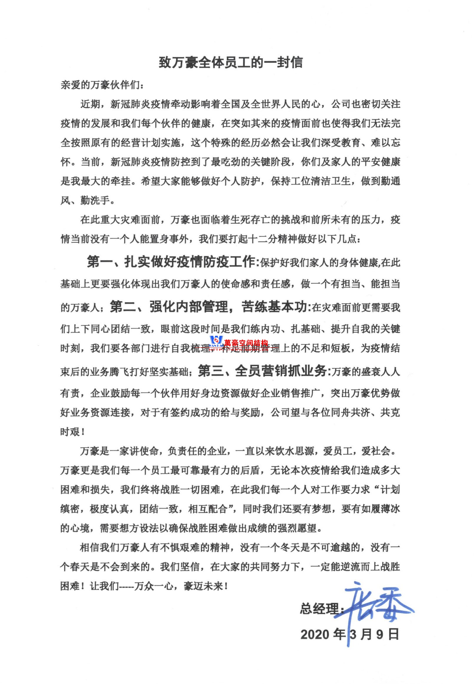 萬豪空間結(jié)構(gòu)總經(jīng)理致全體員工的一封信