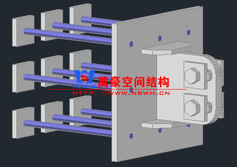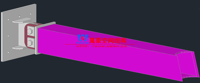 施工安裝步驟:預(yù)埋件測(cè)量及校正 → 預(yù)埋件鉸接耳板焊接 → 牛腿螺栓固定 → 主結(jié)構(gòu)吊裝 → 連接梁、斜撐吊裝 → 馬道安裝 → 膜結(jié)構(gòu)安裝。