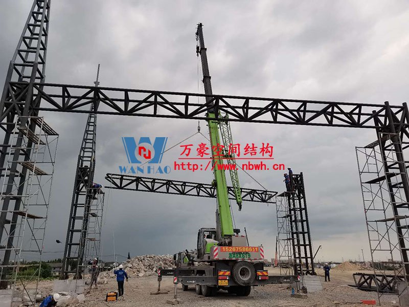紹興西高速收費(fèi)站頂棚工程用鋼量80噸,由寧波萬豪空間結(jié)構(gòu)工程有限公司加工和安裝。