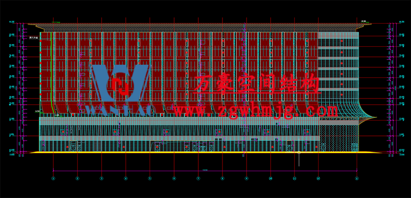 該項目屋面材料選用高自潔PTFE膜材,膜結(jié)構(gòu)展開面積合計20000平米。項目共有256跨懸挑,其中最大懸挑32m,最小懸挑4m。中間由向上托拱聯(lián)接而成,后面與鋁板交接,是常規(guī)類大型體育場館。