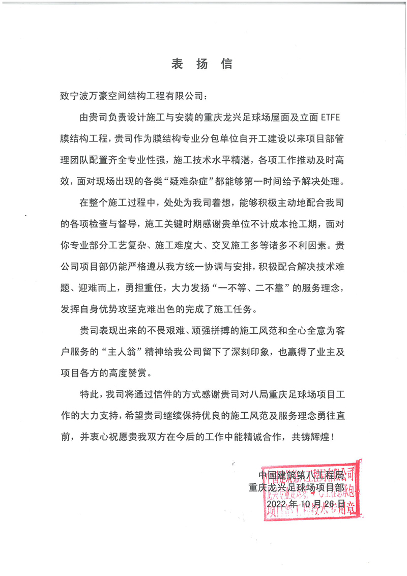 特此,中國建筑第八工程局重慶龍興足球場(chǎng)項(xiàng)目部致以定制錦旗與感謝信給與嘉獎(jiǎng)。