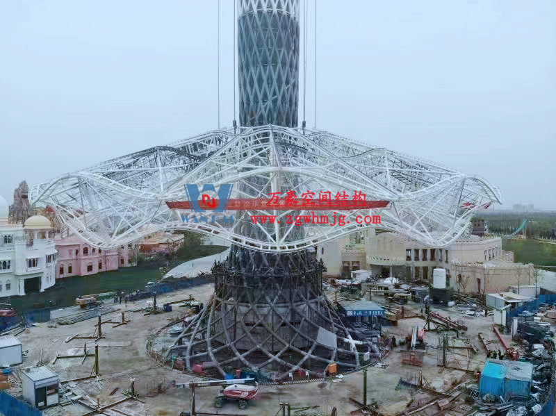 近日,作為絲路歡樂世界的地標建筑,I TOWER的裙擺部件已經(jīng)提拉安裝完畢,遠處望去,整個工程主體效果已基本顯現(xiàn)!