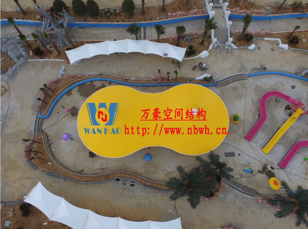 海闊天涳水世界位于浙江省象山縣大目灣新城,北與松蘭山國家“AAAA”級風(fēng)景旅游區(qū)相接,東臨大目洋,南連東陳鄉(xiāng),距象山縣城8公里,成為大目灣新城最先動建的重大膜結(jié)構(gòu)功能性項目,由寧波萬豪空間結(jié)構(gòu)工程有限公司承建。現(xiàn)場測量、深化設(shè)計、制作及安裝由寧波萬豪空間結(jié)構(gòu)工程有限公司全權(quán)負(fù)責(zé);用鋼量高達(dá)180噸,建筑面積達(dá)5000平米。