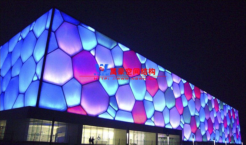 水立方是我國首次使用ETFE充氣式膜材料。在水立方尚未建造之前,我國還沒有在幕墻中使用ETFE膜材料的先例。水立方的整個(gè)建筑中除了入口處用了玻璃之外,其他地方全部采用充氣膜材料,內(nèi)部沒有一根柱子。ETFE充氣膜材料在歐洲有十多年的運(yùn)用歷史,基本上都是用在游泳館和冬季花園建筑方面的,它質(zhì)量輕、保溫隔熱性好,同時(shí)還有透光、防雨、自潔等特點(diǎn),最大的充氣膜材料建筑達(dá)3萬平方米。