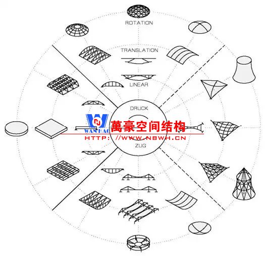 網(wǎng)殼結構的定義有三個關鍵詞:“曲面”、“桿件”、“薄膜作用”。我們從而可以找到網(wǎng)殼結構在結構體系中的位置。