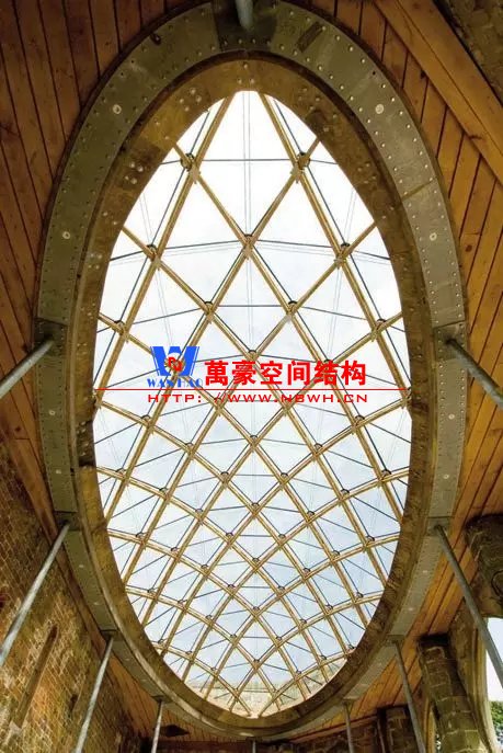 這是一個古老的鑄鐵網(wǎng)殼,建于19世紀后期。可以看出,這個網(wǎng)殼沒有斜桿,它是利用桿件的抗彎能力來抵抗平面的扭轉。