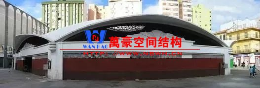 再比如托羅哈1933年在瑞士設(shè)計(jì)的阿赫西拉斯鎮(zhèn)集市屋面。正八角形穹頂直徑達(dá)47.6m,曲率半徑為44.2m。作為單一的球殼,它的跨度第一次超越了萬(wàn)神廟穹頂。殼體厚度最小為8.9cm,厚跨比是1/535;支承點(diǎn)附近加厚至45.7cm。