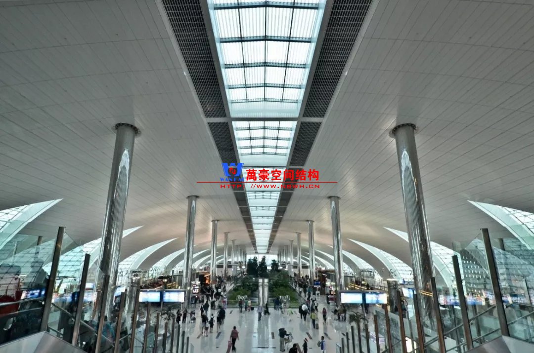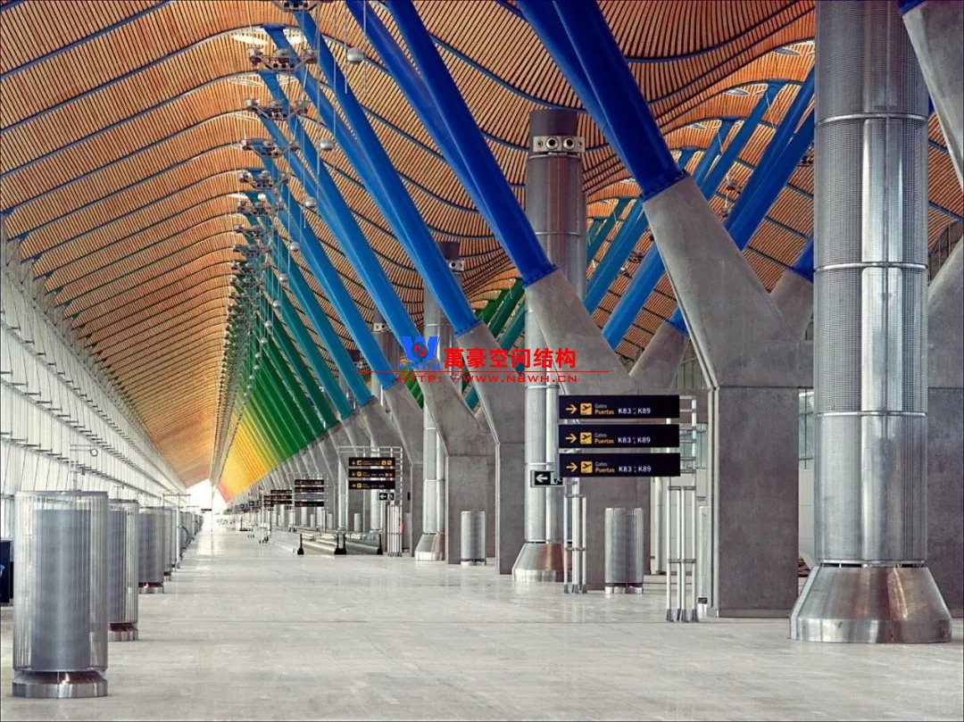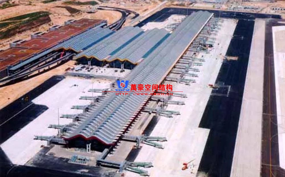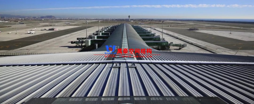 如巴塞羅那機場的指廊就是采用簡單的鋼框架結(jié)構(gòu)體系,鋼柱布置于兩邊;幕墻采用剛性幕墻,貼近鋼柱外側(cè)布置;室內(nèi)吊頂無天窗,吊頂走向沿長向,空間上有指向性。