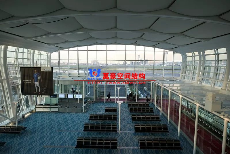 大阪關(guān)西機場則采用弧形鋼梁+索的結(jié)構(gòu)體系,有效減小了鋼梁尺寸,同時由于沒有天窗光線作用,鋼索并不明顯??赡苁怯捎谌毡臼堑卣鸲喟l(fā)地區(qū),外露的支撐構(gòu)件比較多略顯雜亂。