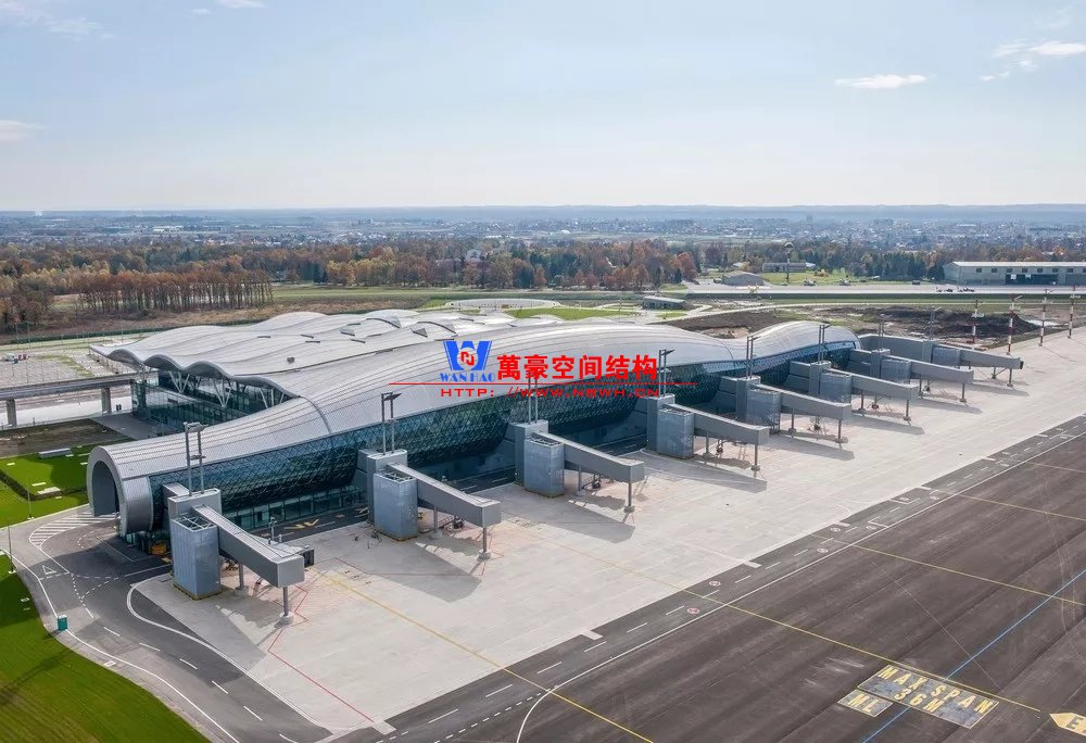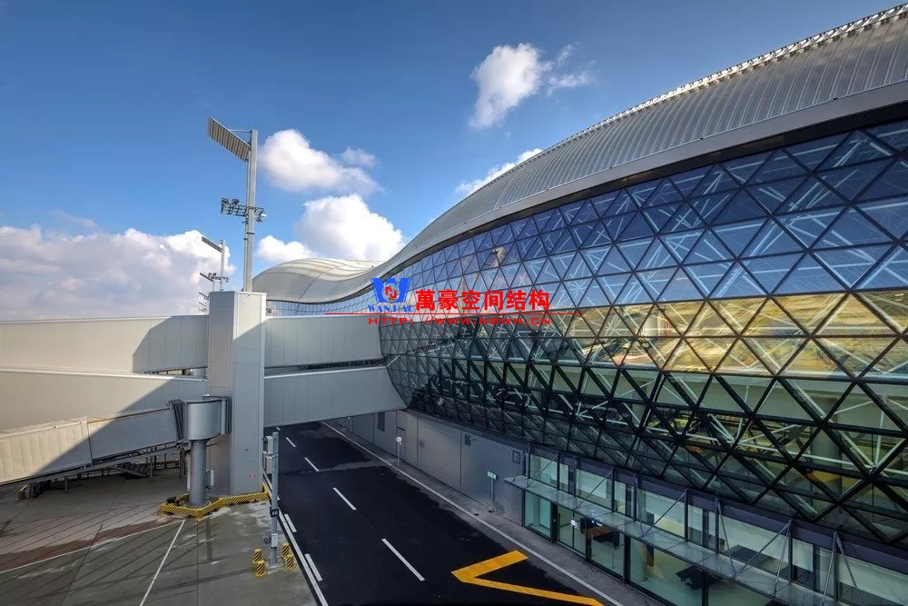 克羅地亞札格瑞布機場剖面也是筒形,結(jié)構(gòu)采用網(wǎng)架結(jié)構(gòu),但網(wǎng)架沒有外包。網(wǎng)架構(gòu)件和網(wǎng)架球節(jié)點直接暴露在近人的尺度,但從照片上看并沒有顯得很雜亂,這可能是因為結(jié)構(gòu)構(gòu)件和節(jié)點的尺度控制的很好,細而密的構(gòu)件顯得比較精細。