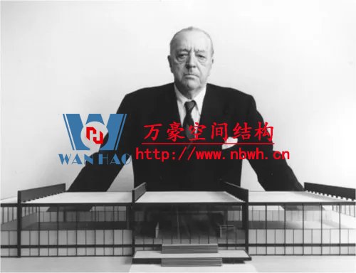 1942年,密斯制作了一個音樂廳的照片拼貼畫,采用阿爾伯特·康于1937年設(shè)計的格倫·馬丁飛機組裝大樓的室內(nèi)做為背景,在其中設(shè)置了木材和鋼板制成的靈活的墻和頂棚,疊加上他的基本空間概念。阿爾伯特·康是為亨利·福特和其他底特律汽車工業(yè)家服務(wù)的建筑師,設(shè)計了適應(yīng)于汽車生產(chǎn)線的大空間廠房。30年代末,美國的鋼鐵技術(shù)已經(jīng)能夠生產(chǎn)更大的斷面,焊接方法開始在建筑中替代鉚接,使節(jié)點更為簡潔。這些新技術(shù)促成了更大跨度的屋蓋,增加了建筑空間的可能性。1952-1953年,密斯又發(fā)展了康拉德·瓦克斯曼為美國空軍機庫所設(shè)計的結(jié)構(gòu),為芝加哥會議中心設(shè)計了一個會議大廳,約720英尺見方,屋面采用網(wǎng)架結(jié)構(gòu),結(jié)構(gòu)高度約30英尺,側(cè)面端頭懸挑達(dá)60英尺。拼貼畫的室內(nèi)使用大理石紋理代表大空間內(nèi)的墻體飾面。密斯引用康和瓦克斯曼的結(jié)構(gòu)做為自己作品的支撐,啟示了一個鋼結(jié)構(gòu)通用大空間的新時代。