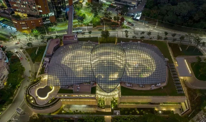作為拉丁美洲最先進(jìn)的醫(yī)學(xué)研究機構(gòu)之一,阿爾伯特·愛因斯坦醫(yī)學(xué)教育研究中心(Albert Einstein Education and Research Center, AEERC)坐落在巴西圣保羅莫倫比住宅區(qū),是巴西第一所由私立醫(yī)院建立的醫(yī)學(xué)院,被認(rèn)為該領(lǐng)域最重要的學(xué)習(xí)及研究機構(gòu)之一。3,800平方米的玻璃屋頂,由三個巨大的穹頂互相交疊而成,組成了一個網(wǎng)格化的殼體,以最輕的鋼結(jié)構(gòu)撐起了86米的巨殼。同時,多層玻璃的組合設(shè)計,兼具濾光、散熱和吸聲功能。天窗外層由1854塊高透明度玻璃板構(gòu)成,使用的玻璃材料反射率極小,可以避免反光影響。此外,玻璃板涂有三層銀面,能夠減少太陽輻射熱能,印在其上的半透明陶點還可用于遮陽。天窗內(nèi)層為透明的ETFE膜結(jié)構(gòu),其上設(shè)有微型孔洞用于吸收噪音,并印有定制的半透明圓點以輔助遮陽。天窗的穹頂中央幾近透明,而靠近東西兩端圓點密度逐漸增大,使得充足的自然光可以照向中央花園茂盛的植物,而東西方向的低角度陽光則被有效遮蔽。同時,這些圓點在自然光下形成獨特的光線效果——從下方看,層層疊疊的點狀圖案仿佛斑駁的樹影,營造出在巨樹下沐浴陽光的獨特感受。薩夫迪建筑事務(wù)所聯(lián)合了國際景觀、環(huán)境和園藝團(tuán)隊,在植物選擇、土壤混合、容器設(shè)計、灌溉、維護(hù)和環(huán)境控制系統(tǒng)等多個方面進(jìn)行了為期兩年的深入研究,并借鑒了新加坡的濱海灣花園(Gardens by the Bay)、星耀樟宜機場(Jewel Changi Airport),以及英國的邱園(Kew Gardens)、伊甸園(Eden project)等項目的成功經(jīng)驗。