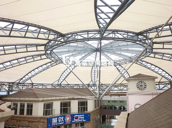 工程位于蕭山開元廣場商業(yè)購物中心,整體工程采用骨架穹頂結構,屋面直徑為50米,總面積約6000平方米,屋蓋體系脈絡清晰流暢,造型簡潔有力,力圖體現(xiàn)結構與材料的自身美感,精致的鋼架,潔白的膜材,賦予建筑高技派和未來主義色彩。
