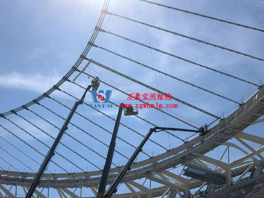 該項(xiàng)目采用車輻式索膜結(jié)構(gòu)體系,其中膜結(jié)構(gòu)由屋面內(nèi)環(huán)ETFE氣枕結(jié)構(gòu)、屋面外環(huán)PTFE膜結(jié)構(gòu)及立面PTFE膜結(jié)構(gòu)組成。 其中,屋面ETFE氣枕由萬豪空間結(jié)構(gòu)深化設(shè)計(jì)及安裝,ETFE氣枕投影面積20000平方米左右。