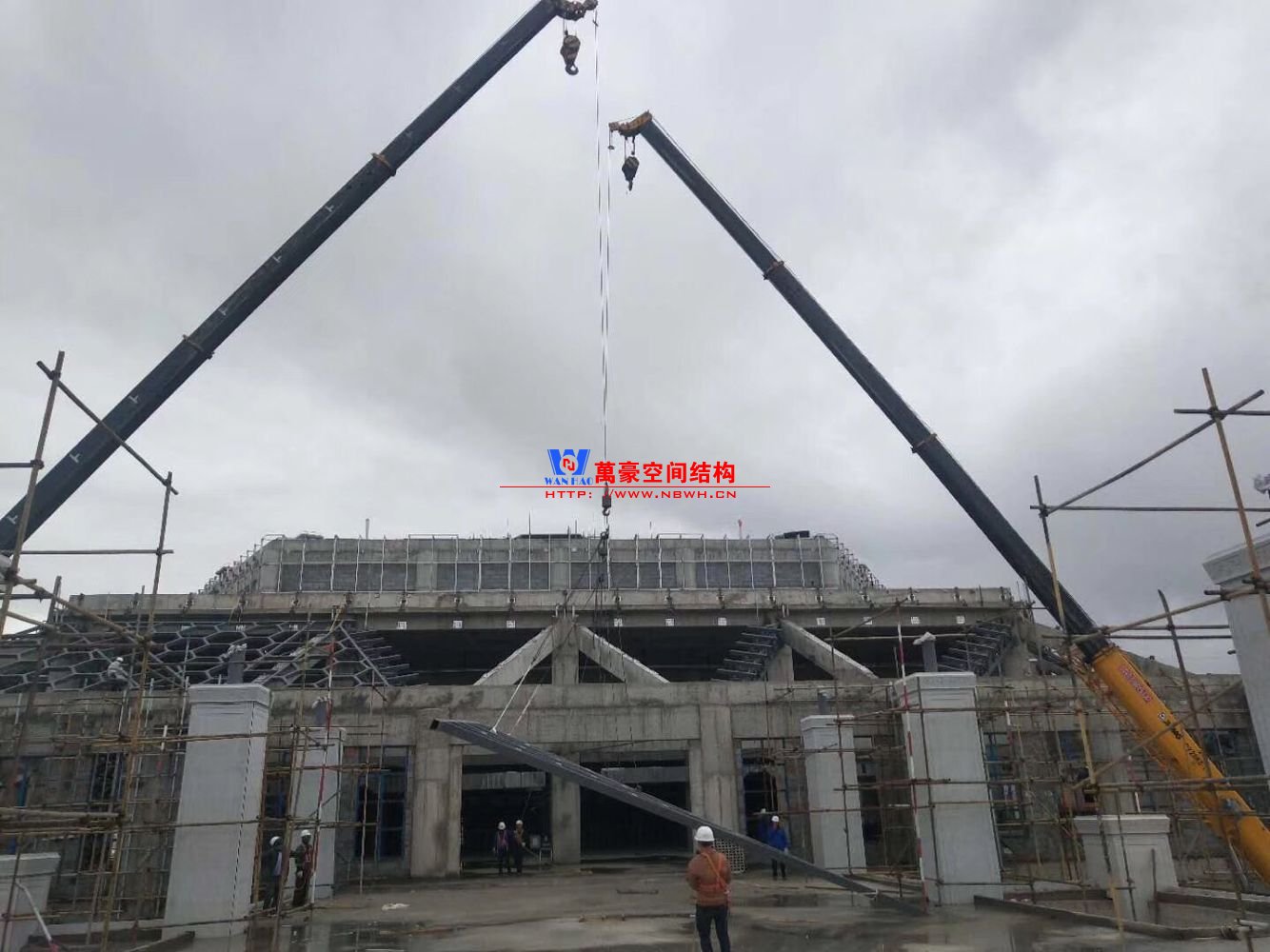 目前,主樓六邊形、二樓斜屋面每面四根大梁已全部安裝完畢,現(xiàn)在一個面的其他鋼構(gòu)正在安裝中,穹頂大梁框架完成。