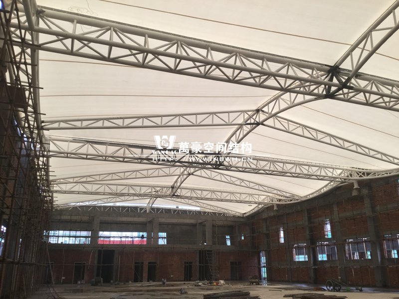 橫店影視城夢(mèng)幻谷海豚館膜結(jié)構(gòu)工程順利完工,工程完工后達(dá)到了設(shè)計(jì)要求,工程完成后的效果得到業(yè)主及領(lǐng)導(dǎo)的一致好評(píng)。本膜結(jié)構(gòu)工程寬94米,長(zhǎng)61.5米,高21.3米,面積4163平方米。本工程采用藍(lán)色膜布,和海豚館的環(huán)境想配合能達(dá)到更好的效果。同時(shí)公司在嘉善三小體育館工程也大部分完工,本工程長(zhǎng)50.68米,寬25.7米,高15米,面積1400平方米。